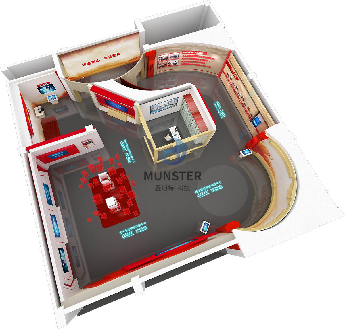 项目详情:曼斯特科技携手合作伙伴以“信仰的力量”为主线,运营VR体验、滑轨AR推拉屏、弧幕投影技术、拼接屏+电控玻璃+投影等数字多媒体技术,采用红白两色为主色调,打造简洁、现代、科技具有党建特色的党建体验中心,全面展现西宁党建的历史和成就,突出宣传、教育、体验、智慧四大功能,丰富了西宁党建的内涵和形象。