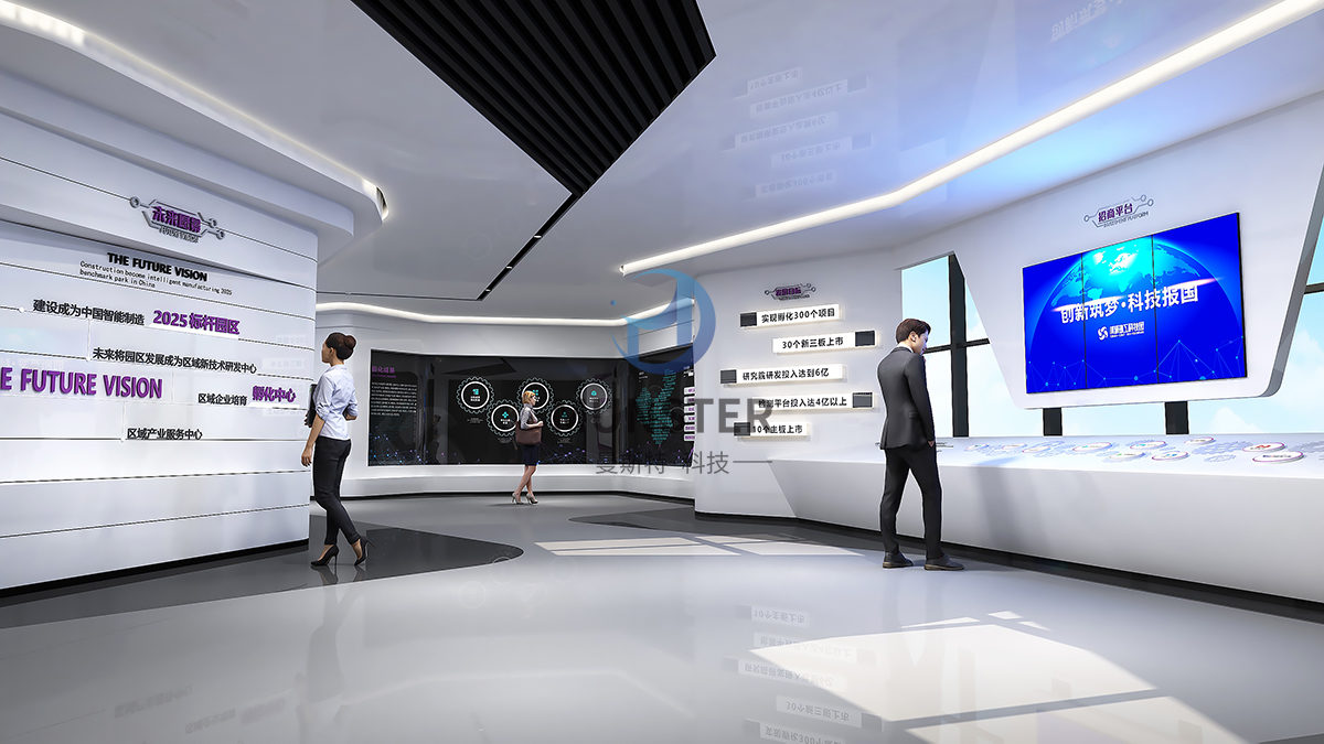 项目详情:曼斯特科技为清研理工科技园展厅布展了绘.蓝图毕现、起.智从新来、势.得天独厚、擎.产业集聚四个展区区域,分别展示了园区的总体规划战略布局、清研体系概况和发展历程、几大产业成果和展望,并运用数字沙盘、弧幕、大屏、互动多媒体等多媒体高科技展项赋予展厅科技感、未来感和智慧感,致力于打造中国制造2025标杆智慧园区,吸引优质企业入驻,助力运营者招商引资,展望未来。