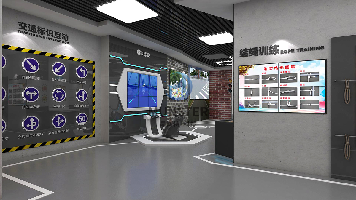 项目详情:曼斯特科技紧扣安全体验教育主题,从模拟体验火灾、烟雾通道逃生、高楼逃生、地质灾害、急救知识等多方面,通过VR模拟、场景模拟、大屏展示、屏幕互动等数字展项打造现代高科技、沉浸式的展示空间,助力科普教育走进群众。